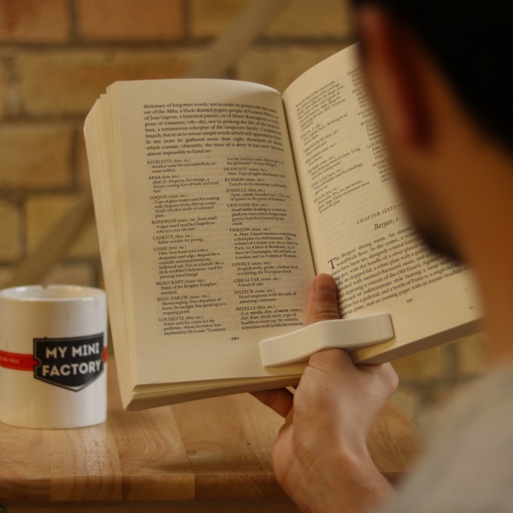 Auf jeden Fall wohl ein schönes Buch. Blöd nur, wenn aufgrund einer Einschränkung nicht beide Hände den Schmöker umschließen können. Die Lösung kommt mal wieder aus dem 3D-Drucker. Die Ein-Hand-Lesehilfe wird auf den Daumen gesteckt und hält so schön ordentlich die Buchseiten auseinander.