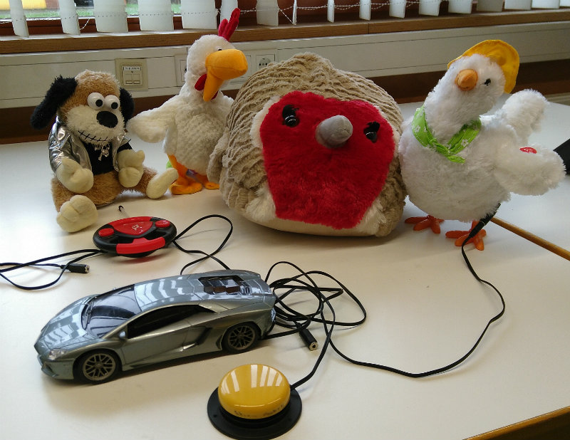 Beim Mini-Bugatti wurde die Fernbedienung so adaptiert, dass gleich vier Switches angeschlossen werden können: links, rechts, vorwärts und rückwärts. Bei uns in der Schule würde dies bedeuten, dass ich etwa ein Drittel aller Taster zusammensuchen müsste, die bei uns im Einsatz sind. Zum Glück gibt es endlich eine Möglichkeit die Knöpfchen selber herzustellen. Gerade habe ich meinen ersten selbst gedruckten und zurechtgelöteten Schalter im Lehrerzimmer ausgestellt. Darüber schreibe ich in den nächsten Tagen. Hier seht ihr das Gespann: