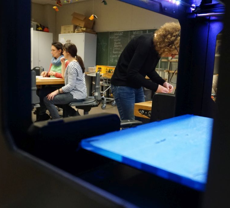 Ich schleiche dabei um den Tisch, versuche Hilfestellungen zu geben und starte wiederholt den 3D-Drucker, um Nachschubmaterial zu drucken. Am großen Werktisch ist die Stimmung derweil konzentriert. Isolierband, Lötzinn, Scheren und Kabel werden herumgereicht. Wieder ist es toll zu beobachten, wie sehr sich gegenseitig geholfen wird. Ich kann es kaum erwarten mal mit einer inklusiven Schülergruppe in so einer Runde zu sitzen. Die Planungen dazu laufen nach wie vor und ich hänge ein wenig in der Warteschleife. Ich hoffe, es gibt bald mehr darüber zu berichten. Doch zurück zum Workshop: Nach etwa einer Stunde sind die ersten Erfolge zu vermelden und die Atmosphäre am Tisch ist gelöst. Das Fluchen wird größtenteils abgelöst von erleichterter Freude, wenn das mit dem eigenen Batterieunterbrecher ausgestattete Spielzeughündchen durch den Druck auf den persönlich gebastelten Taster loskläfft.