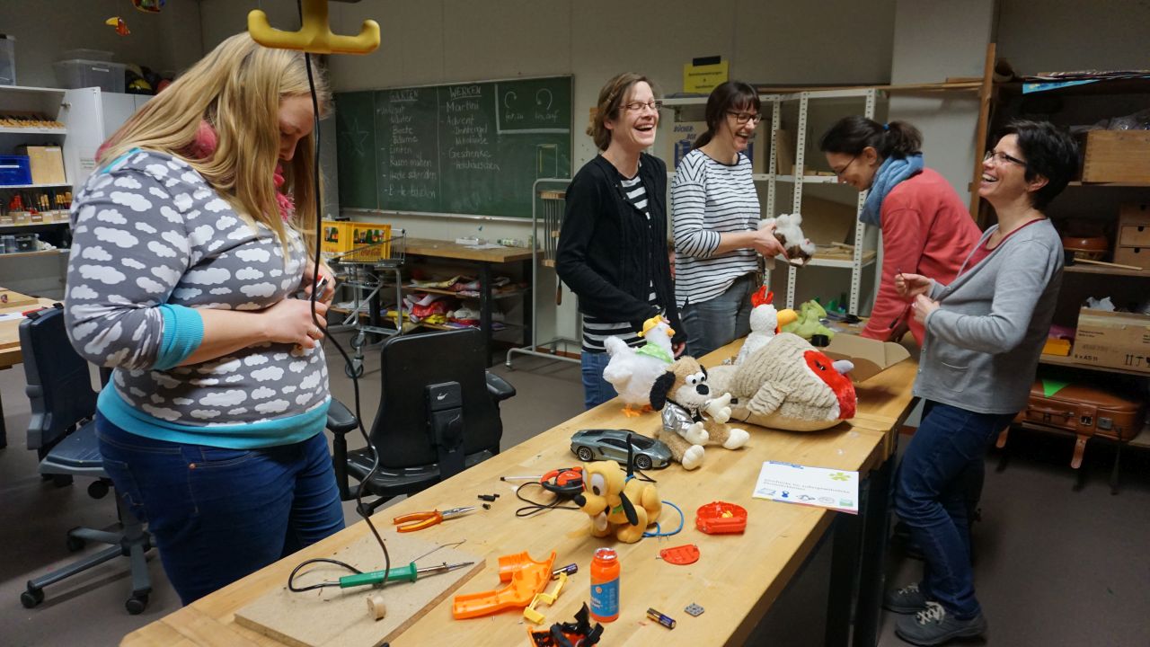 Wieder der lange Tisch und die Frauengruppe. Diesmal lachen die Frauen, währen am linken Rand eine blonde Frau eine Zange benutzt. Lötkolben und Plastikteile sind auf dem Tisch.