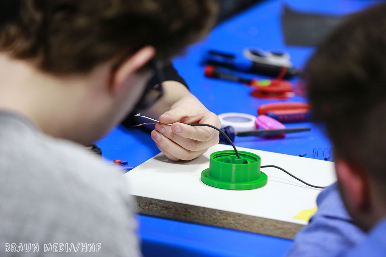 Wundervoll angeleitet von den Mitarbeitern des Schülerlabors konnten die Schüler fast unmittelbar loslegen. Auf der großen Tischreihe lagen die Utensilien bereits parat: Lötkolben, -hilfe, -zinn, Schleifpapier, Zangen, Taster, Schalen und das Material bestehend aus Kabeln, Tastern und Druckfedern. Das Tastergehäuse kommt dabei aus dem 3D-Drucker. Leider gibt es nach einem Druck immer noch einige Stellen, die etwas Nachbearbeitung brauchen. Daher durften erstmal wieder das Schleifpapier und die Kneifzangen gezückt werden. Nach und nach legten die Nachwuchs-Elektrotechniker die Schalter an den Lötstationen um: „Wow, das wird 300° heiß?!“, war es an mancher Stelle zu hören. Deshalb noch einmal die Ermahnung: „Vorsichtig arbeiten! Immer das richtige Ende anfassen!“ Wieder andere Schüler wussten allerdings schon bescheid: „Ich habe zuhause schon mit meinem Vater gelötet“, erklärt eine Vierzehnjährige im E-Rollstuhl. Das Mädchen braucht aufgrund ihrer Behinderung bei der Arbeit mit den Kabeln und dem Kolben ein wenig Unterstützung. Ganz selbstverständlich bekommt sie es von ihrem Teampartner der Gesamtschule, der die Zange reicht oder die Kabel hält.