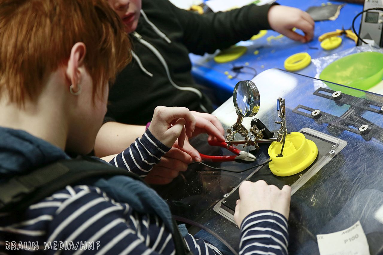 Ein Mädchen arbeitet auf ihrer E-Rollstuhl-Ablage. Ein Schüler reicht ihr eine Zange.