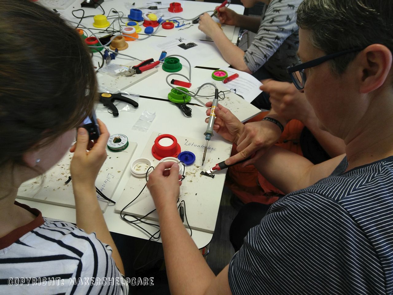 Lötkolben und Taster sind zu sehe .Eine Frau lötet mit Hilfe ihres Sitznachbarn.