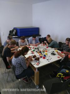 Gut ein Dutzend Menschen sitzen um einen Tisch mit vielen Kabeln und bunten Gehäusen aus dem 3D-Drucker.