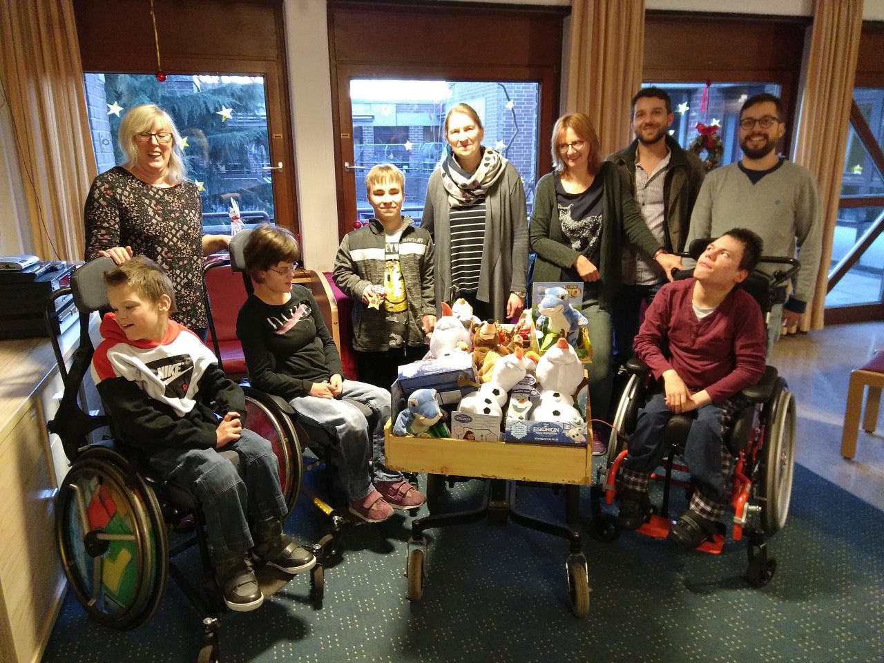 „Es ist so schön, dass wir etwas bekommen! Häufig sind die Spenden für die anliegende Schule“, erzählt Heimleiterin Sarah Held-Diesel, als wir den übervollen Karren mit Spielzeug in die Wohngruppe bringen. Gerade kommen die SchülerInnen nach Hause, ziehen sich noch die Jacken aus und bekommen direkt das erste Spielzeug in die Finger. Luzie freut sich und wippt begeistert im Rollstuhl. Ich kenne das lebhafte Mädchen noch aus meiner Zeit auf der Paderborner Förderschule. Eine weitere Mitarbeiterin wird aufmerksam und bemerkt erstaunt: „Das sind ja viele Spielzeuge und alle haben bereits ein Kabel!“ Ich erzähle noch ein wenig von unserem wundervollen Vormittag, frage nach einem Foto und gehe mit dem tollen Gefühl, die Spielzeuge genau an die richtige Adresse gebracht zu haben. In der Tür höre ich noch den Tanzbären singen.