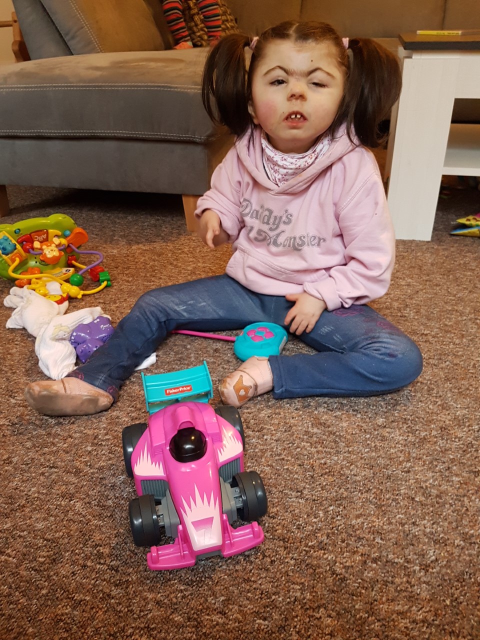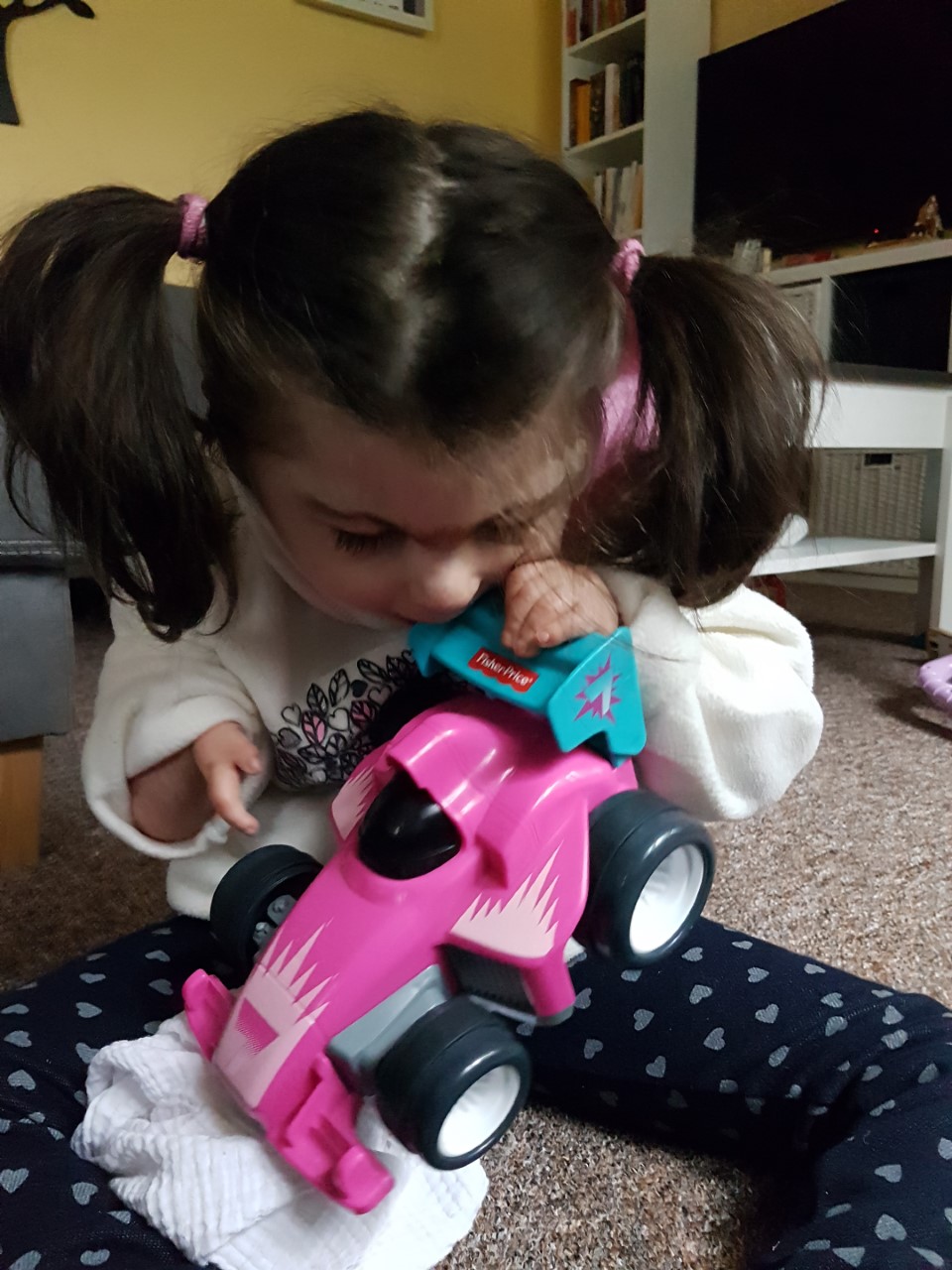 Natürlich habe ich sofort auf dem Blog vorbei geschaut. Dort gibt es noch mehr so schöne Fotos, wie die, die an der E-Mai hingen und Annika mit ihrer Schwester zeigen, wie sie sich über den rosa Flitzer hermachen.