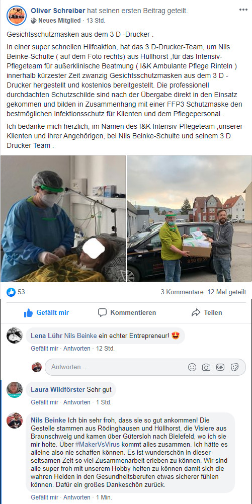 1. Hallo Nils, ich habe diesen Link von ‚Rene We‘ aus Osnabrück erhalten, der in der facebook-Gruppe darauf hinwies, dass es über ihn (kostenlose) Visiere für Medizinpersonal gibt. Ich bin wohnhaft in Osnabrück, unsere Praxis ist jedoch in Herford. Vielleicht kannst du mir nun weiterhelfen. Wir sind ein Team aus 12 Ergotherapeuten & Logopäden und arbeitet aktuell täglich mehrere Stunden mit Alltagsmaske. Da diese auf Dauer sehr warm sind und mitunter die Ohren reizen, wäre eine Alternative wirklich toll!